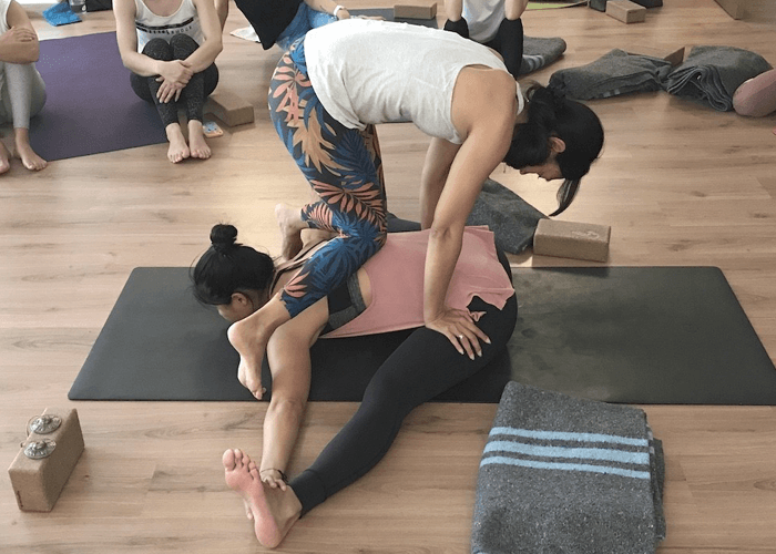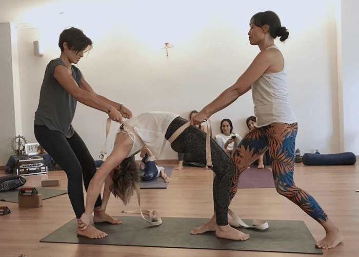 Algo muy característico también del método Jivamukti Yoga son los “yoga assists“, ajustes o asistencias físicas del profesor al alumno.